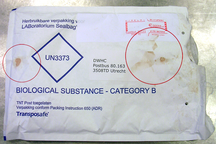 Zorgen bij het inpakken dat de buitenste envelop niet vies wordt (zie Handleiding praktische uitvoering bemonsteren)