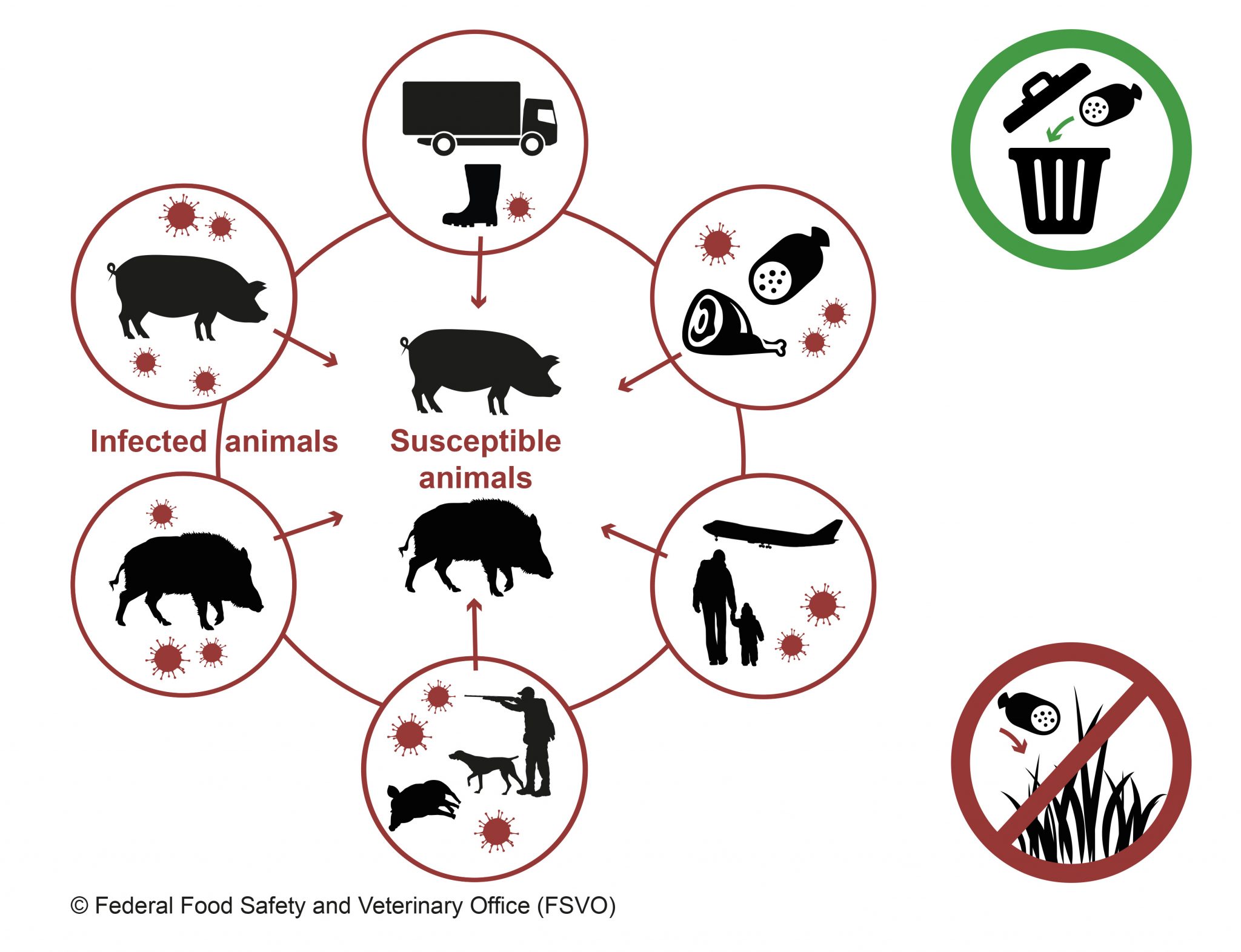 Toeristen en mensen die in het veld komen kunnen het virus ongemerkt meenemen, bijvoorbeeld door het meenemen van varkensvlees/vleeswaren en varkensvleesproducten. Gooi nooit restanten van brood met varkensvleeswaren, of ander voedsel dat varkensproducten bevat, in de natuur. Ook al is de kans op overdracht via materialen niet heel groot, toch moet ook daar rekening mee gehouden worden. Het is dan ook belangrijk om deze zorgvuldig met water en zeep te reinigen en goed te laten drogen.