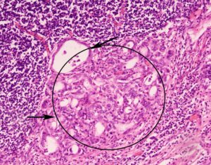 Onderzoek van de knobbel gaf een verrassende uitkomst. De knobbel was een zakje gevuld met bloed. Een dergelijke grote bloeduitstorting doet in eerste instantie denken aan gevolgen van een harde stoot, klap of ander trauma. Maar bij het microscopisch onderzoek bleek dat de wand van het zakje bestond uit zweetklierkanker (apocrien carcinoom). De bloeding was dus in een tumor ontstaan. De tumor zelf was weliswaar nog klein, en gaf nog geen problemen voor het ree, maar was al wel uitgezaaid in de directe omgeving. Als het dier niet was afgeschoten, zou de kanker later zeker verder zijn gaan uitzaaien. Op de detail foto is het microscopisch beeld te zien van een lymfeknoop met uitzaaiing van de klierkanker. In het omcirkelde gebied zie je tumorweefsel: de cellen vertonen een rommelige opbouw (chaos) en de buisjes van de klierkanker zijn duidelijk zichtbaar (pijltjes).