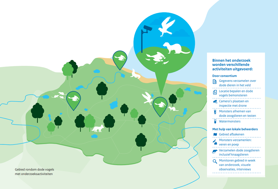Het Strong One Health-project bestaat uit verschillende deelonderzoeken, zoals het onderzoek naar vogelgriep en aaseters (zie figuur). Zoogdieren kunnen besmet worden met vogelgriep door het eten van besmette vogels. Hierdoor bestaat de kans dat het virus zich aanpast en besmettelijker of ziekmakender wordt voor mensen en andere zoogdieren. Lees meer informatie op, en om te helpen met dit onderzoek, de website van het RIVM.