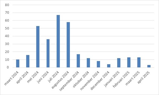 In totaal zijn 1.102 monsterpakketjes uitgezet. Hiervan zijn 324 (29%) teruggestuurd, 2 hiervan hadden helaas geen formulier en waren dus niet bruikbaar. Van de overige 322 zijn de meeste bloedmonsters tussen mei 2024 en augustus 2024 opgestuurd (figuur 1).
