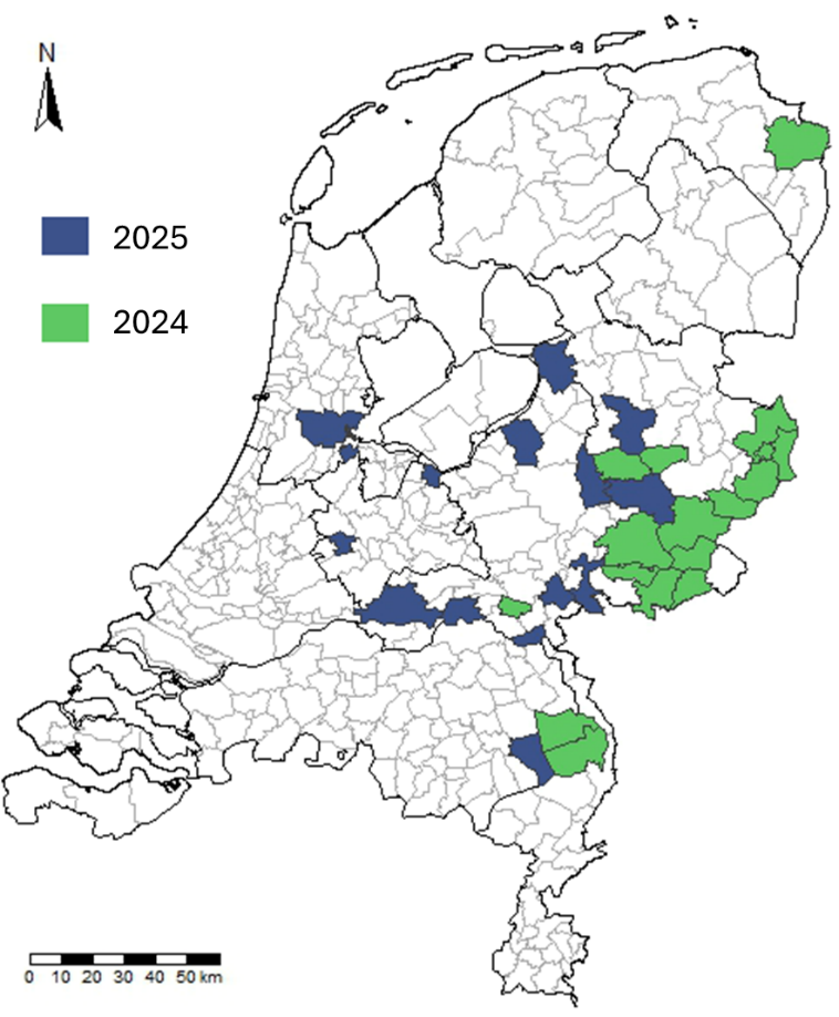 Ha-MYXV is dus een opkomend virus. Het DWHC probeert de verspreiding ervan in Nederland bij te houden, en de manieren van verspreiding te begrijpen. Hieronder een kaart van de gemeenten met bevestigde hazenmyxomatosegevallen. In groen de gemeenten waar de ziekte in 2024 voor het eerst werd vastgesteld en in paars de gemeenten waar de ziekte voor het eerst in 2025 werd vastgesteld.
