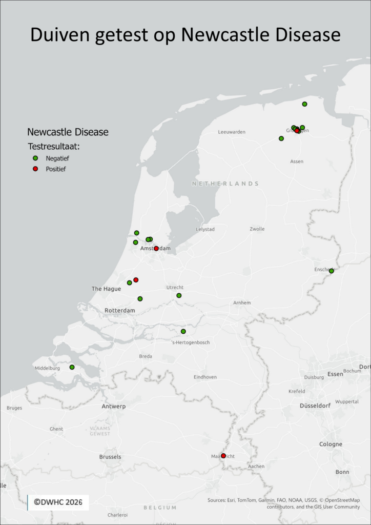 Tot nu toe zijn in totaal 27 duiven, voornamelijk stadsduiven, opgehaald en getest op Newcastle Disease. Van deze duiven testten vijf positief: twee stadsduiven uit Groningen, één uit Amsterdam, één uit Alphen a/d Rijn, en één uit Maastricht (zie figuur 1). Momenteel worden meerdere duiven uit verschillende delen van Nederland onderzocht.