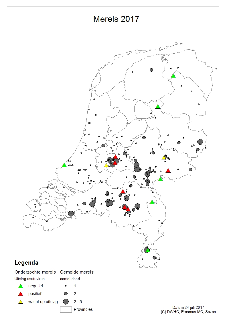In the wake of the 2016 Usutu virus outbreak, surveillance of live and dead blackbird numbers in April of 2017 revealed that the virus is once again active in the Netherlands.This was paralleled by a slight increase in the number of dead blackbirds reported to the DWHC compared to the preceding weeks. According to figures from the bird migration station of the Dutch Institute of Ecology and Erasmus Medical Center, Usutu virus was found in living blackbirds during the period from April-June 2017. At the end of June there was a clear increase in the number of reports of dead blackbirds over a short time period. From the end of June until the 20th July 2017 the DWHC, in collaboration with Erasmus MC, investigated the cause of death in seven blackbirds: Six of these tested positive for Usutu virus. The combination of these findings with the experience of the previous year and the rise in the number of reports of both sick and dead blackbirds, points to a new outbreak of Usutu virus in the Netherlands. The map shows the locations of the findings to be predominantly in the East, Middle and South of the country.