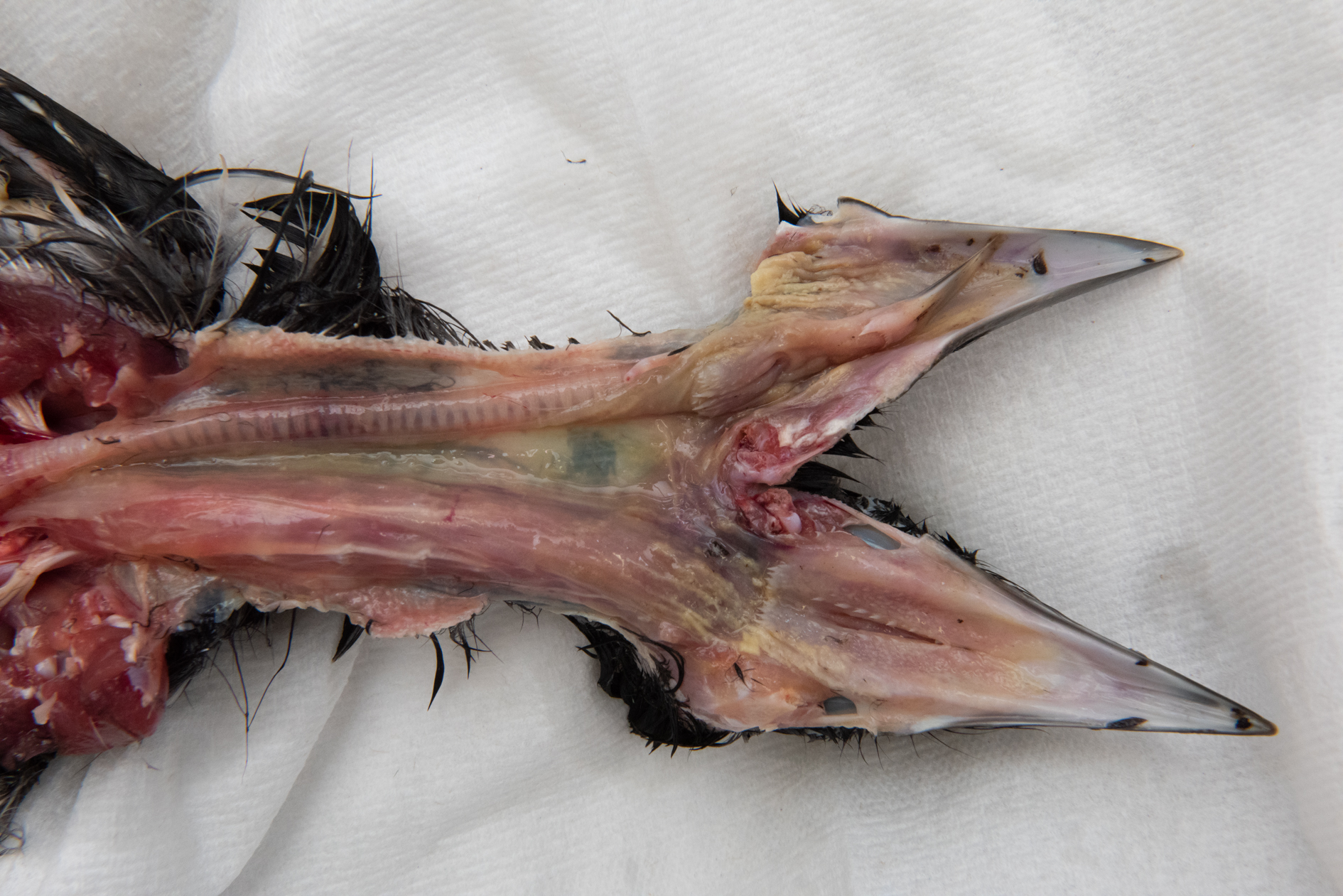 In May 2018 a sick immature Eurasian Magpie (Pica pica) was brought to birdhospital Naarden where it died. The fresh cadaver was submitted to the DWHC for post-mortem investigation. The manager suspected that the magpie had died due to the disease ‘pigeon canker’. Post-mortem investigation confirmed that the magpie had died of inflammations in the mouth and oesophagus which were caused by the parasite Trichomonas gallinae.
