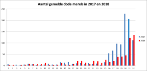 Diagnostics by the DWHC and Erasmus MC show that mortalities are due to usutu virus. In last week of July and the first week of August, 14 common blackbirds were examined and tested for usutu virus. Of the 14 birds, 13 died due to usutu virus infection and the cause of death of one bird was determined to be avian malaria. Avian malaria, like usutu virus, is transmitted by mosquitoes. Usutu virus was also detected in Zeeland (most south western province) and the northern part of Groningen, thereby spreading throughout nearly all of the Netherlands. Due to our experiences in 2016 and 2017, combined with the information on the symptoms of the ill common blackbirds, we believe another usutu virus outbreak is currently ongoing.