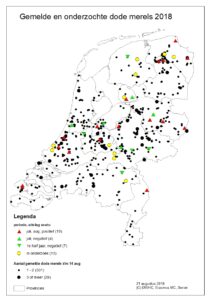 Diagnostics by the DWHC and Erasmus MC show that mortalities are due to usutu virus. In last week of July and the first week of August, 14 common blackbirds were examined and tested for usutu virus. Of the 14 birds, 13 died due to usutu virus infection and the cause of death of one bird was determined to be avian malaria. Avian malaria, like usutu virus, is transmitted by mosquitoes. Usutu virus was also detected in Zeeland (most south western province) and the northern part of Groningen, thereby spreading throughout nearly all of the Netherlands. Due to our experiences in 2016 and 2017, combined with the information on the symptoms of the ill common blackbirds, we believe another usutu virus outbreak is currently ongoing.