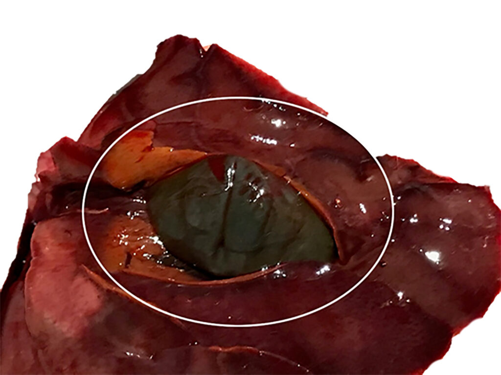 If an animal is not gutted within a few hours, a gallbladder imprint may be visible on another organ.