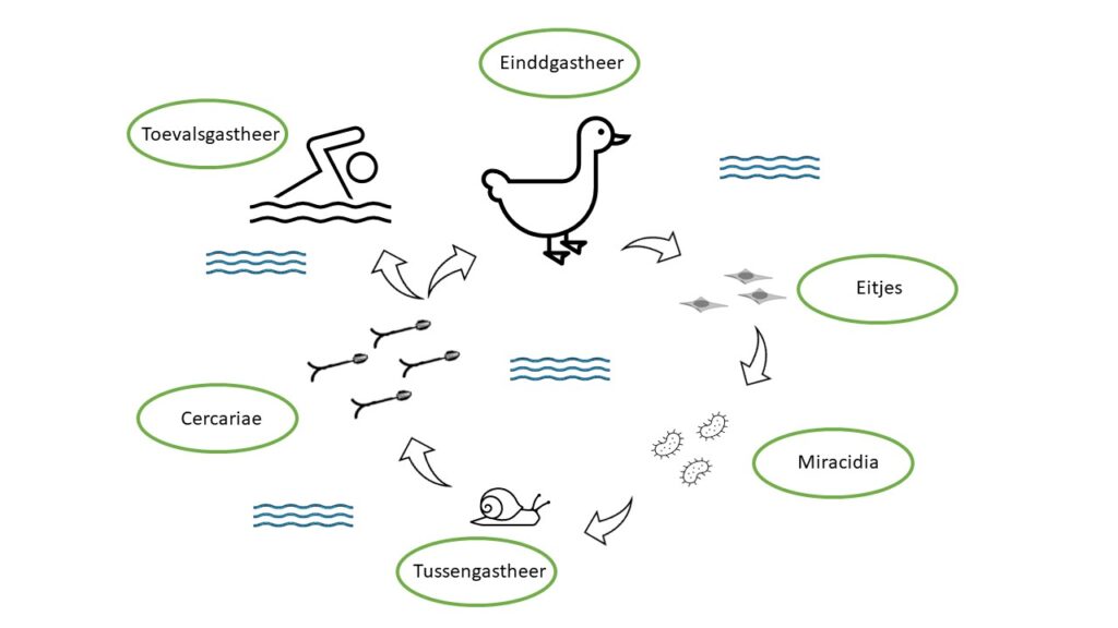 The adult worms live in ducks and swans (the final hosts). Their eggs are released into the water with the bird’s feces. Miracidia (young phase of the worms) are released from these eggs and are eaten by freshwater snails (intermediate host). In these freshwater snails they multiply and then thousands of cercaria (the next young phase of the worm) are released into the environment. These cercaria are attracted by the sunlight and go towards the surface of the water in search of a new final host (a duck or swan) to be able to grow into an adult.