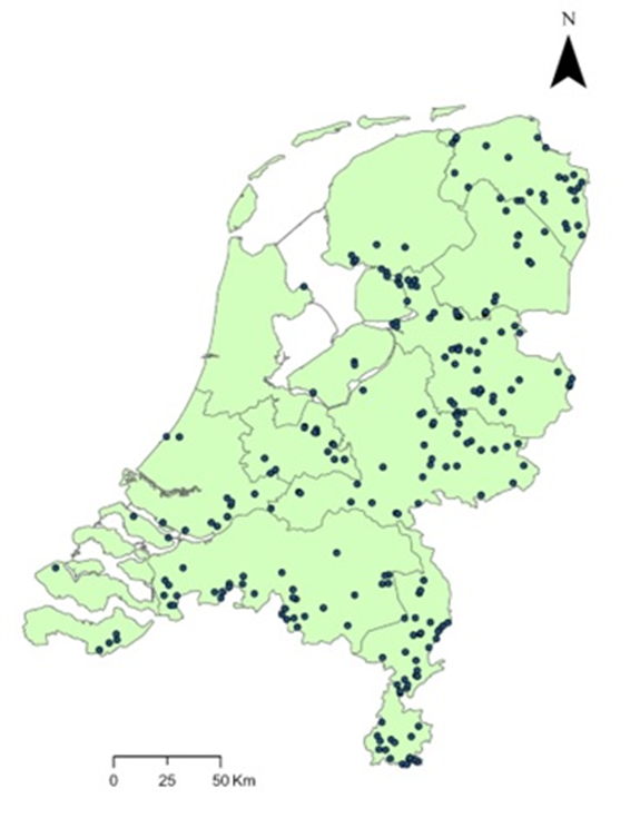 The Dutch Wildlife Health Centre has sent out blood sampling kits to game management units/hunters and managers responsible for coordinating found wild animal carcasses via the wildlife management units. In the figure below you can see the locations we received blood samples from. Up until now, 22% of the sampling kits sent out have been returned.