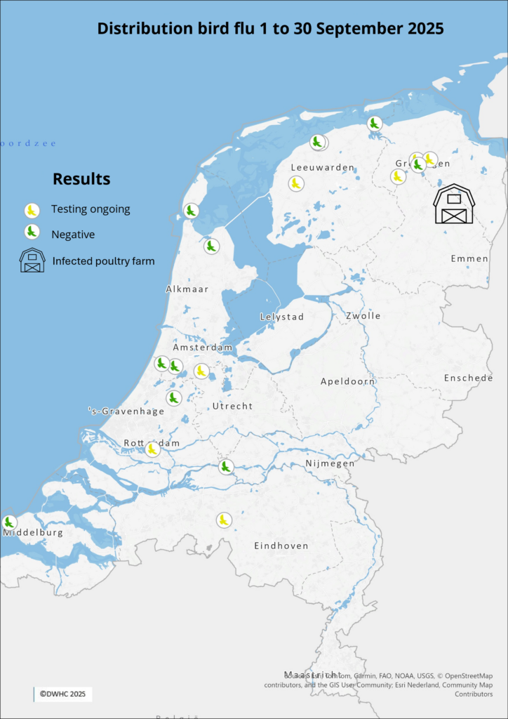 More information about the outbreak at the farm in Gasselternijveenschemond can be found on the government website: https://www.rijksoverheid.nl/onderwerpen/vogelgriep/nieuws/2025/10/07/vogelgriep-vastgesteld-in-gasselternijveenschemond (in Dutch)