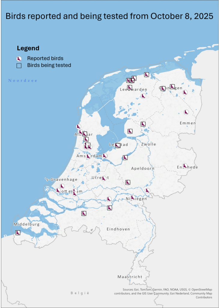 We are receiving reports from the provinces of Groningen, Flevoland, North Holland, and Friesland. The DWHC has had several birds collected from these areas (see map). They are being tested for avian influenza. As soon as the results are available, we will share them on our website.