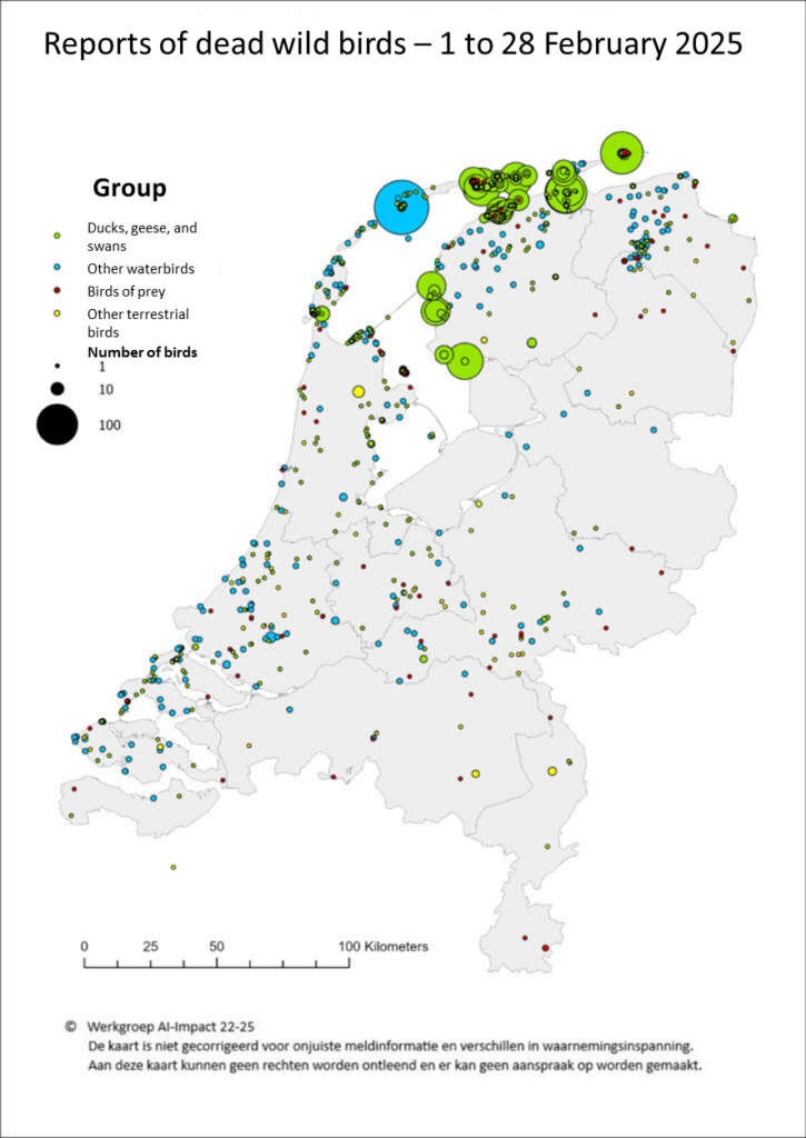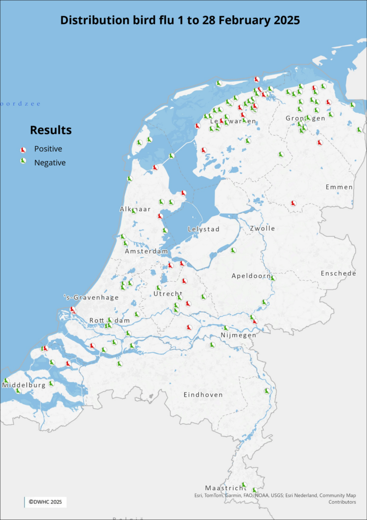 The DWHC, together with Sovon, Waarneming.nl, and the Bird Flu App, monitors where dead wild birds have been found in the Netherlands. The focus is mainly on bird species at risk for avian influenza, but other bird species are also included. The map below provides a national overview of bird mortality in February.
