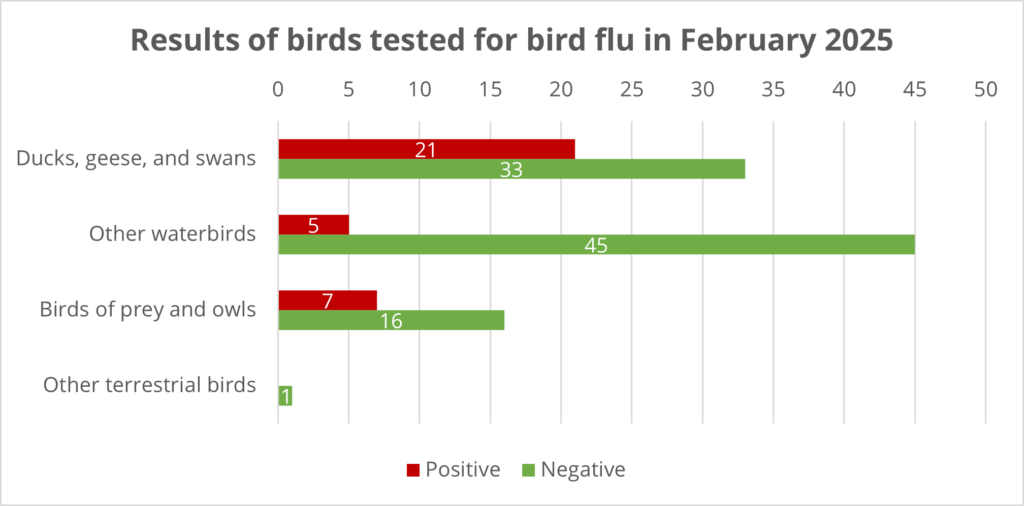 In the month of February, the trend of reports was similar to the previous month. A total of 128 birds were sent by the DWHC to the WBVR for avian influenza testing. Once again, the largest numbers of reported and examined birds were barnacle geese. In addition, increasing numbers of gulls and birds of prey were reported. This month, the less commonly affected bids species that tested positive for infection with the virus included the Eurasian Curlew, common Kestrel, Western Barn Owl, Short-eared Owl, common Eider, Red Knot, and for the first time in 2025: the Ruddy Turnstone.