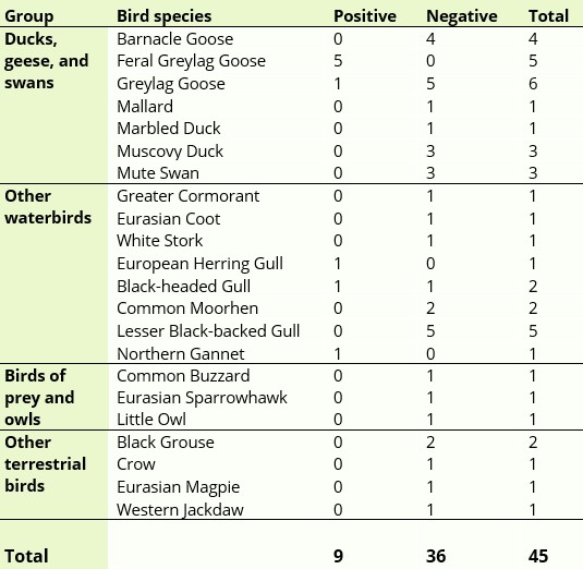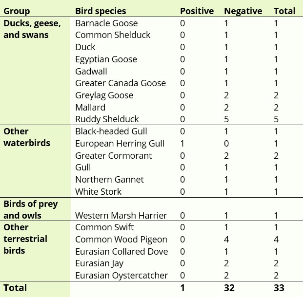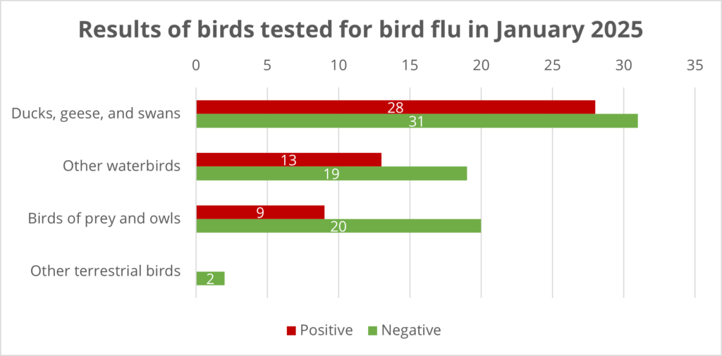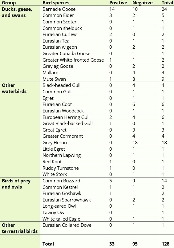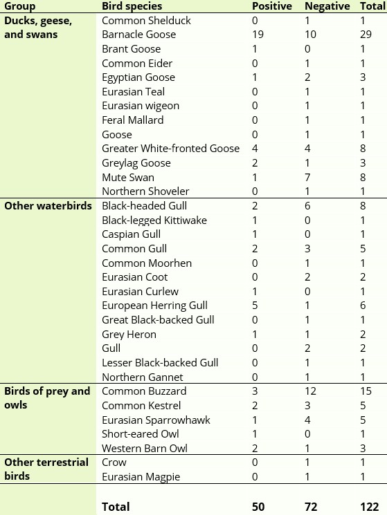 In the month of January, many wild birds were found dead, of which 122 were sent by the DWHC to the WBVR to be tested for avian influenza. These were mainly Barnacle Geese, but throughout the month, more and more gulls and birds of prey were also reported. Other, less common bird species that tested positive for avian influenza this month included the Eurasian Curlew, Grey Heron, and the Common Kestrel.