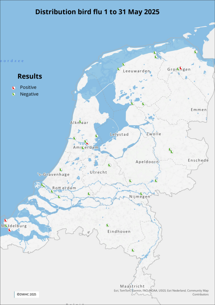 The outbreak of avian influenza among wild birds that began in November 2024 is continuing into 2025. The DWHC is working together with Wageningen Bioveterinary Research (WBVR) in the research on avian influenza. The DWHC regularly receives reports of dead wild birds. Some of these birds were suitable for research and were collected and tested for infection with avian influenza at the WBVR. On this page you can follow the latest updates on avian influenza test results in 2025 per month.