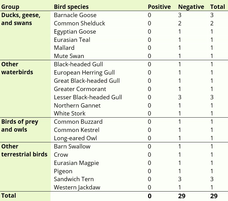 In the month of June, 50 birds were sent to the WBVR by the DWHC to be tested for bird flu. The avian influenza virus was detected in 21 of these birds. Eight birds are still under investigation. In the province of Zeeland, there were many reports of dead wild birds this month, with 20 of these examined for avian flu. Of those, 18 European herring gulls and 1 common tern tested positive. Additionally, in the province of South-Holland, a mute swan and a greylag goose tested positive.