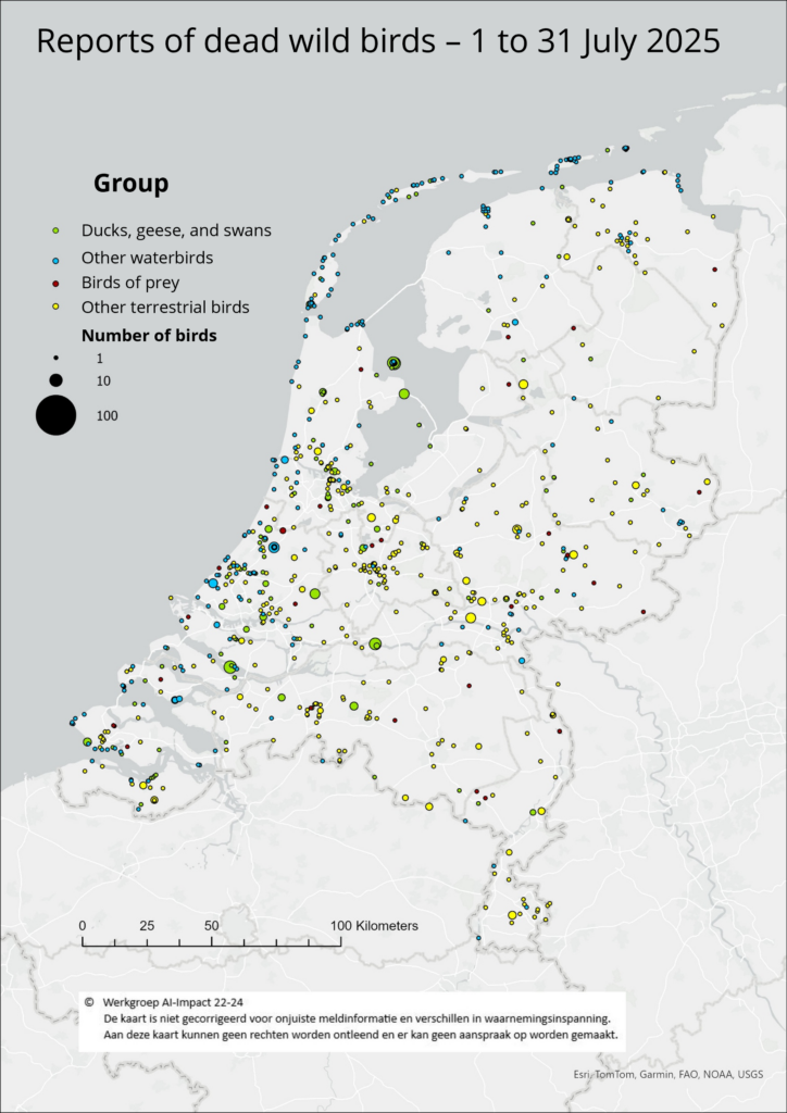 The DWHC, together with Sovon, Waarneming.nl, and the Bird Flu App, monitors where dead wild birds have been found in the Netherlands. The focus is mainly on bird species at risk for avian influenza, but other bird species are also included. The map below provides a national overview of bird mortality in July.