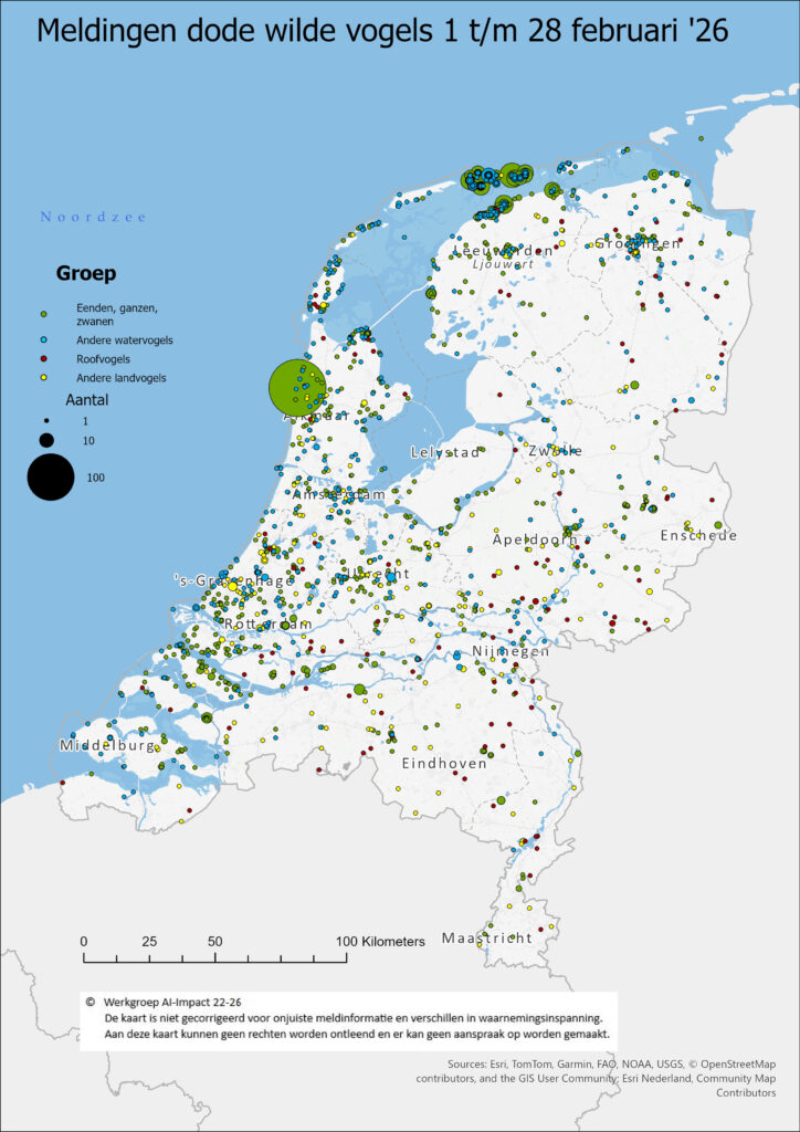 Het Dutch Wildlife Health Centre, samen met Sovon, Waarneming.nl, en de vogelgriep app monitoren waar in Nederland dode wilde vogels zijn gevonden. Het gaat vooral om vogelsoorten die risico lopen op vogelgriep, maar ook andere vogelsoorten zijn hierin meegenomen. Onderstaande kaart geeft een landelijk beeld van de vogelsterfte in februari 2026.