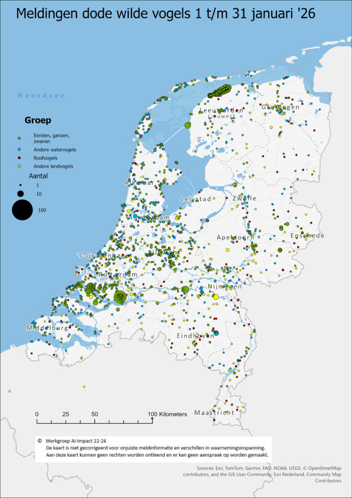Het Dutch Wildlife Health Centre, samen met Sovon, Waarneming.nl, en de vogelgriep app monitoren waar in Nederland dode wilde vogels zijn gevonden. Het gaat vooral om vogelsoorten die risico lopen op vogelgriep, maar ook andere vogelsoorten zijn hierin meegenomen. Onderstaande kaart geeft een landelijk beeld van de vogelsterfte in januari 2026.