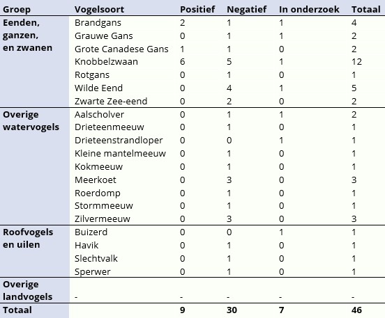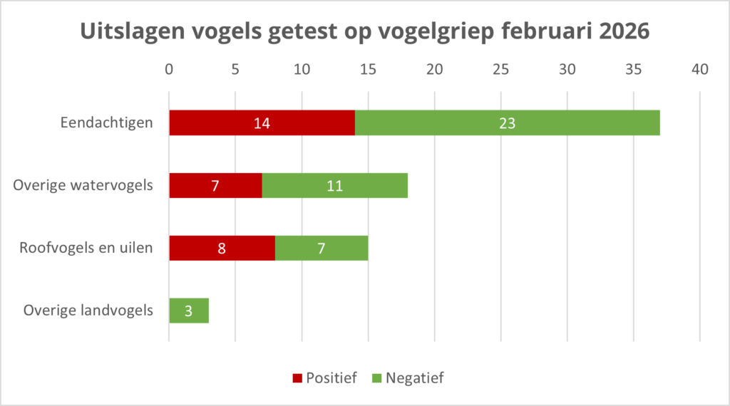 In januari zijn er 82 dode wilde vogels door het DWHC naar het WBVR gestuurd om te testen op vogelgriep. Hiervan zijn 40 uitslagen positief: 24 eendachtigen, 8 overige watervogels, en 8 roofvogels.