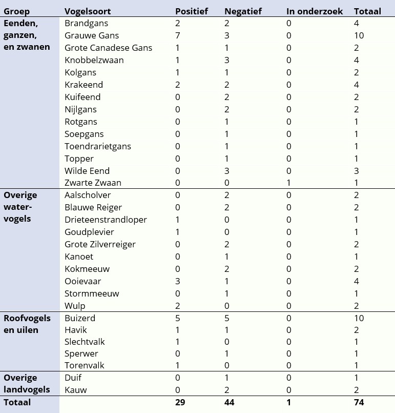 Klik hier voor de uitslagen van de vogelgrieptesten in 2025 per maand.